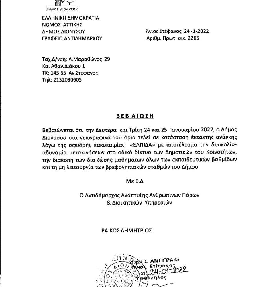 Διόνυσος Κακοκαιρία Ελπίδα: Βεβαίωση αδυναμίας μετακίνησης τις ημέρες της κακοκαιρίας – Ηλεκτρονικά από τον Δήμο Διονύσου24 Ιανουαρίου, 2022 Επικαιρότητα Προβλήματα ηλεκτροδότησης: Σε ποιες περιοχές παρατηρούνται – Τι αναφέρει ο ΔΕΔΔΗΕ24 Ιανουαρίου, 2022 Η πόλη σου Μαρούσι: Τραυματίστηκε δασκάλα που πήγαινε στο σχολείο να κάνει τηλεκπαίδευση24 Ιανουαρίου, 2022 Διόνυσος Δήμος Διονύσου (κακοκαιρία Ελπίδα): Επί ποδός ο Δήμος για απομάκρυνση κλαδιών24 Ιανουαρίου, 2022 Επικαιρότητα Κακοκαιρία Ελπίδα: Προβλήματα στα δρομολόγια του Ηλεκτρικού – Δεν εκτελούνται δρομολόγια στο τμήμα Ειρήνη – Κηφισιά24 Ιανουαρίου, 2022 Επικαιρότητα Κακοκαιρία Ελπίδα: Τα Βόρεια Προάστια σε εικόνες – Φωτορεπορτάζ από τις γειτονιές (pics)24 Ιανουαρίου, 2022 Επικαιρότητα Κακοκαιρία Ελπίδα: Αναβάλλονται οι εμβολιασμοί σε Αττική και Εύβοια24 Ιανουαρίου, 2022262263264265266